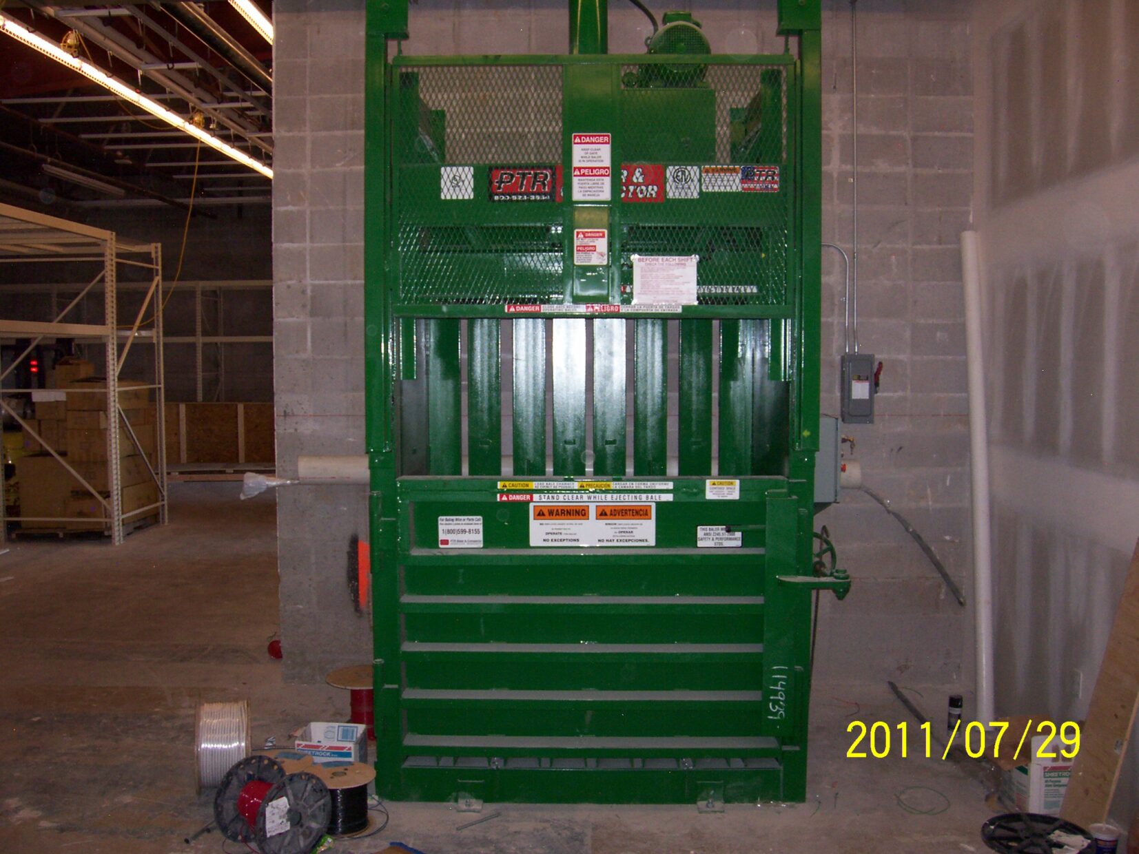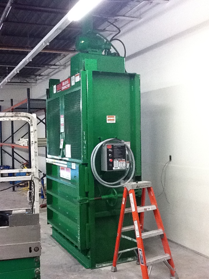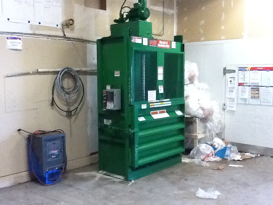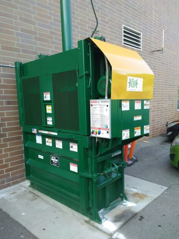 Vertical Balers are designed to compact recyclables like cardboard or plastics. Balers compact the recyclables into bales that can be tied off and then ejected out of the baler onto a pallet for storing. Standard size bales are approximately 60”wide x 30”deep x 48”high and can weigh up to 1300 lbs. A Vertical Baler can reduce your waste stream which will lower your waste disposal costs.